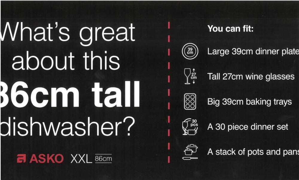 IMPORTANT> THE CLEARANCE CENTRE IS NOW ONLINE ONLY 24/7 FOR SAFER AND GREATER CONVENIENCE! WE ALSO OFFER A SATISFACTION 7 DAY MONEY BACK GUARANTEE*! PLEASE EMAIL DEALS@ASKO.COM.AU FOR ANY MORE INFORMATION AND WE CAN CALL OR EMAIL YOU BACK. 86.5cm DISHWASH DW40.2 DBI654IBXXL.S.AU ASK * THIS MODEL REQUIRES A MINIMUM HEIGHT OF 86.5CM CLEARANCE THE DISHWASHER IS 86.3 IN HEIGHT AND CAN GO UPTO 91CM PLEASE REFER TO TECHNICAL DRAWING. https://www.asko.com.au/products/kitchen-appliances/dishwashers/dbi654ibxxl-s-au